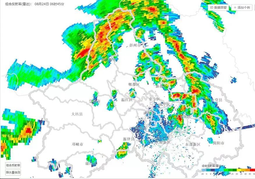 成都市气象台2022年8月24日06时50分发布短时临近天气预报:目前我市都江堰、彭州、新都、金堂、龙泉驿、新津和青白江有对流发展,预计未来6小时,我市有分散阵雨或雷雨,个别地方大雨到暴雨,并伴有短时强降水、雷电和阵性大风,请注意防范。