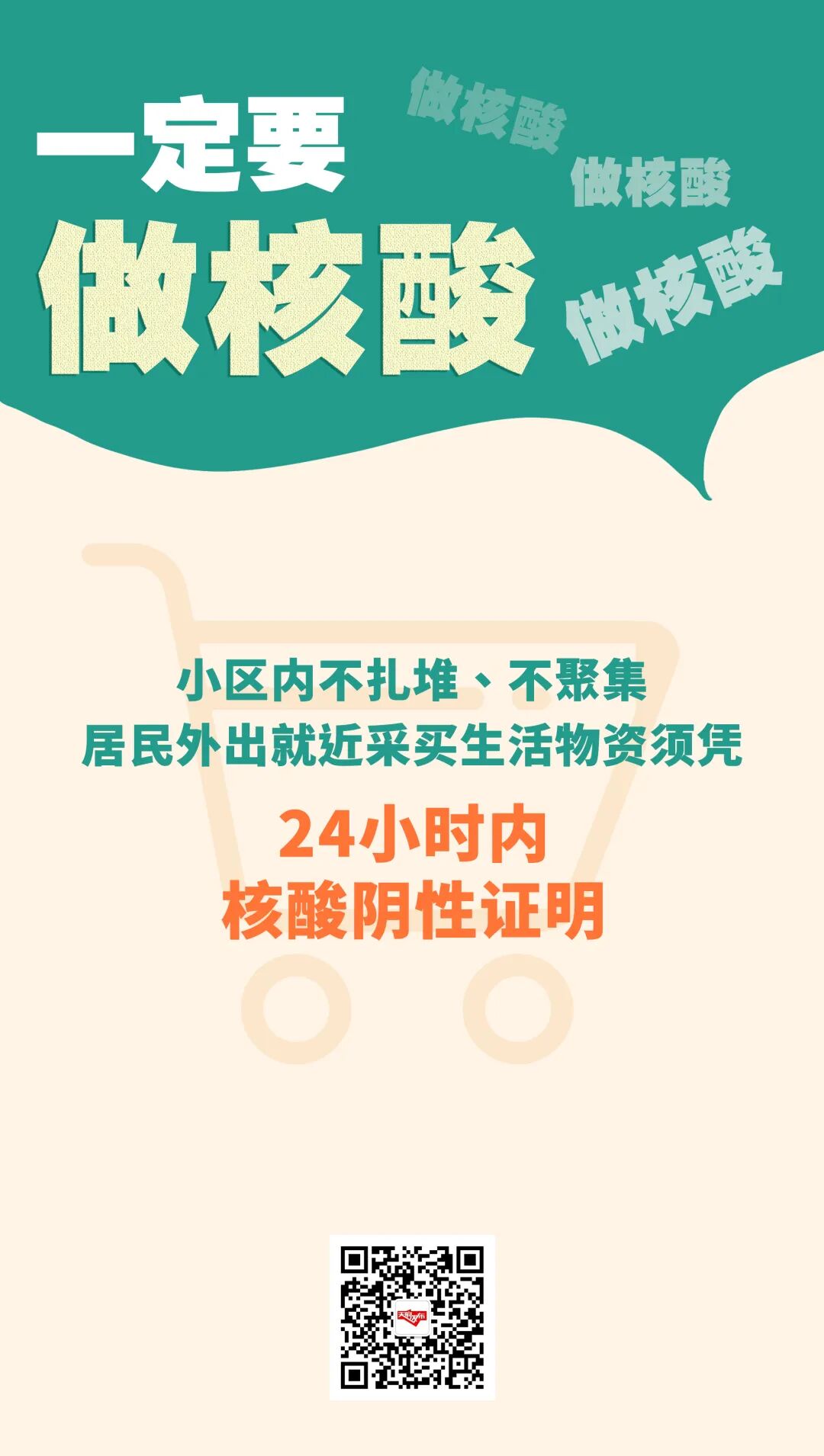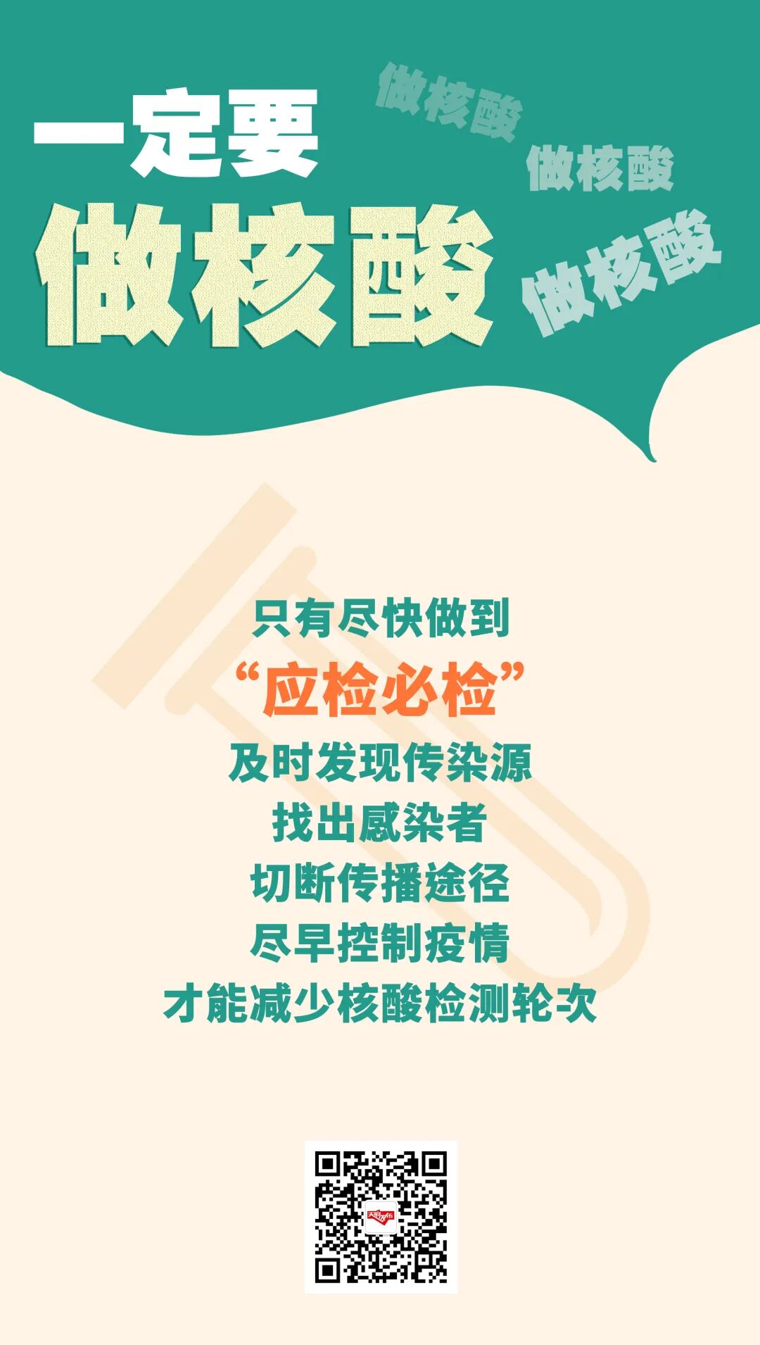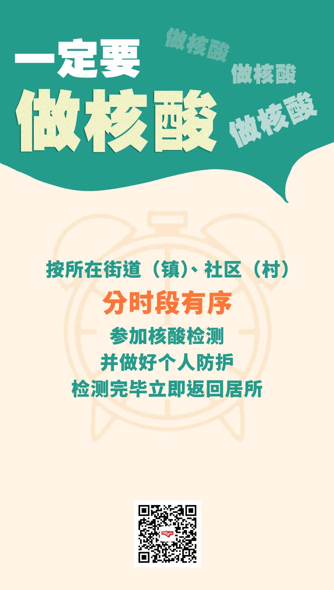 一、全市人员继续按照“应检必检”要求,完成全员核酸检测。请市民密切关注本区域发布的核酸检测时间,按所在街道(镇)、社区(村)通知,分时段有序参加核酸检测并做好个人防护。中高风险区和居家隔离人员按相关防控管理规定执行。
