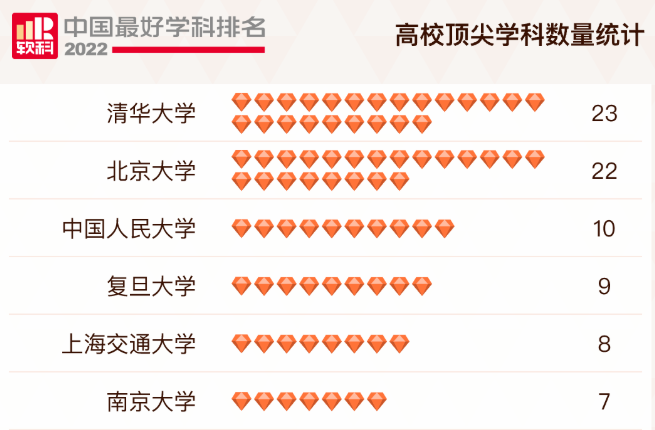 此次统计的中国顶尖学科中,清华大学(23)、北京大学(22)、中国人民大学(10)位列前三甲,之后,分别是复旦大学、上海交通大学、南京大学。