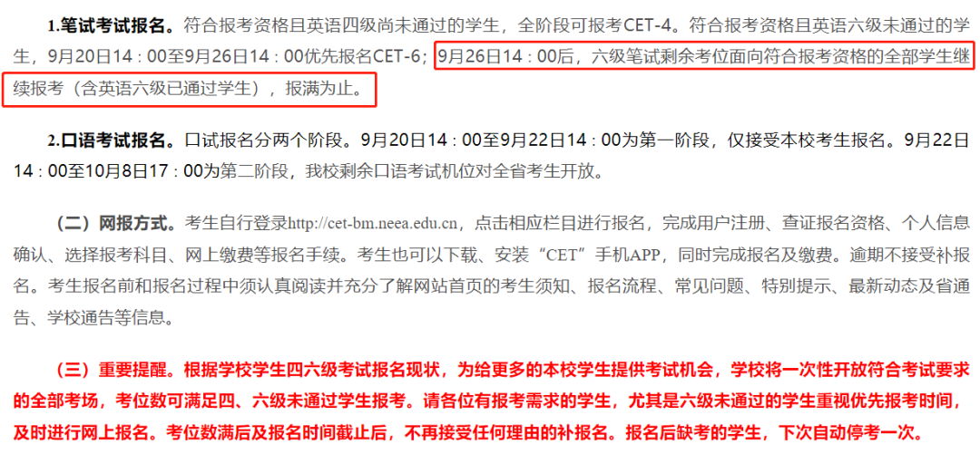 符合报考资格且英语六级未通过的学生优先报名CET-6六级笔试,剩余考位面向符合报考资格的学生继续报考。
