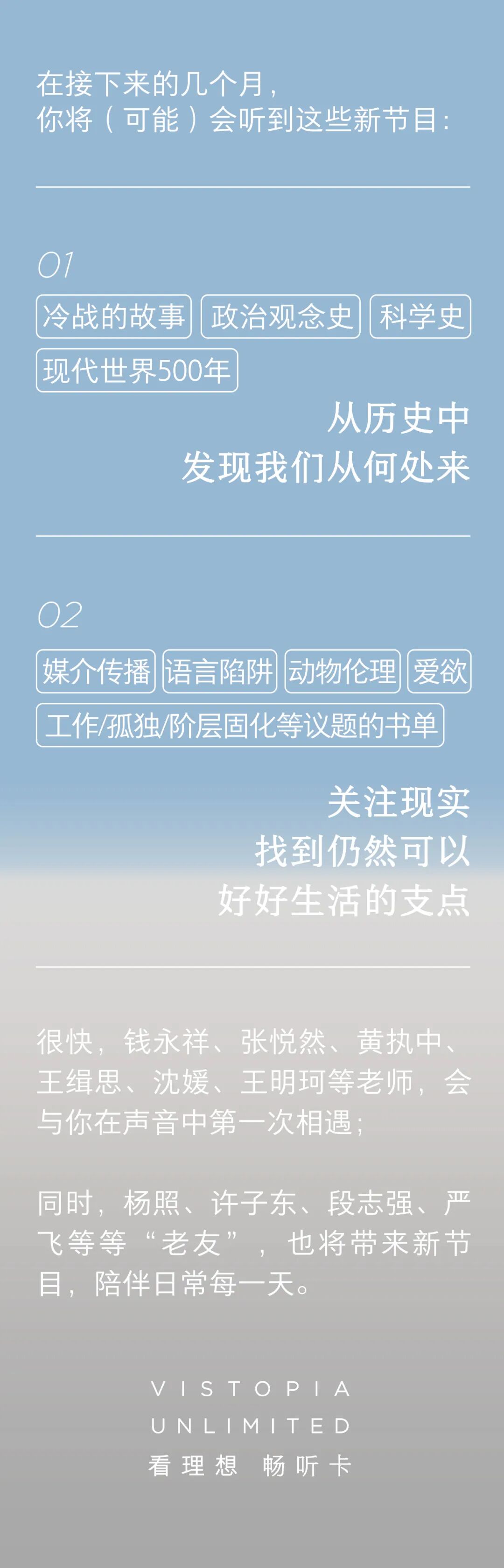 我们会保持每1-2周新节目的更新频率,依然周四上新,在未来一年,会有很多全新主讲人带来全新领域的内容:辨析动物伦理的钱永祥、探讨语言与沟通的黄执中、领读女性作家著作的张悦然、纵览冷战风云的王缉思,解读现代性的汪民安……全年书单节目《无限人生书单》已更新四季,接下来还将关注工作、孤独、阶层固化等议题。