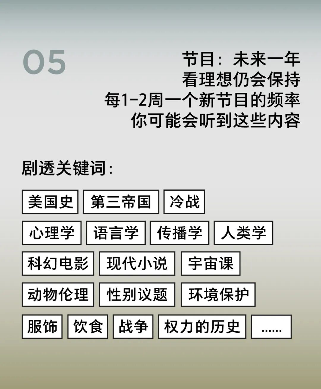 我们会保持每1-2周新节目的更新频率,依然周四上新,在未来一年,会有很多全新主讲人带来全新领域的内容:解读现代性的汪民安、辨析动物伦理的钱永祥、领读外国文学的许志强、探讨语言的黄执中、带来猫族故事的朱天心、探索人格心理的王芳等等。