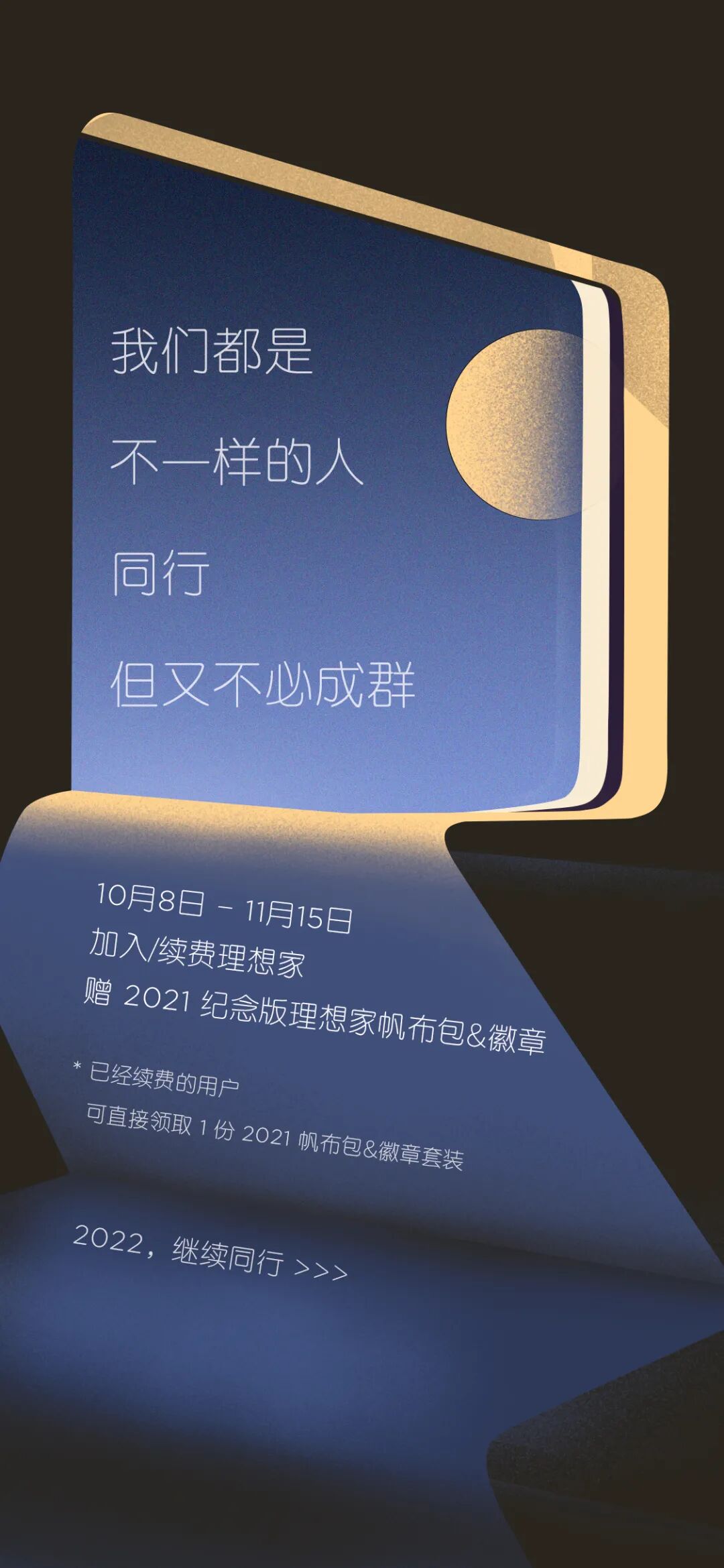 去年10月,我们推出了“理想家”会员计划,理想家们的存在让我们相信还有更多人愿意为好奇心和人文价值挤出一点空间,为我们共同的审美品味努力做一点点事情,为这个世界的丰富性保留更多一丝想象。