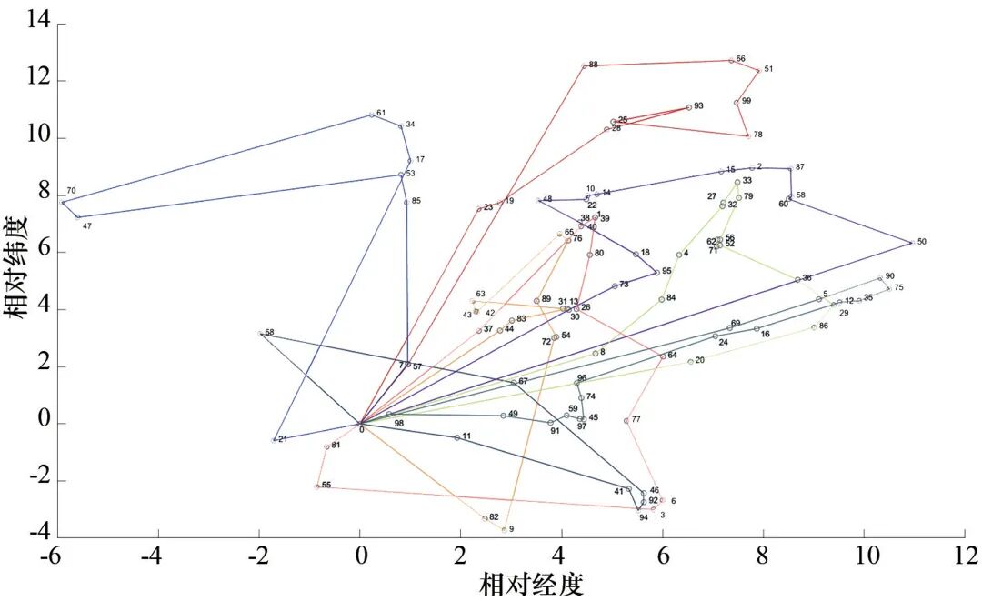 以北京市为例,经过调查和访谈,综合疫情期间配送量、配送力量等考虑,选定了某生鲜配送站以及周边99个小区(编号为1~99)为研究对象。设定每个小区需求范围为100~300 kg,车辆最大载重为3000 kg,车辆行驶速度为25 km/h。每辆车的固定成本为200元/辆,单位距离的运输成本为10元/m,配送时长不超过2 h。算法参数选取种群规模为200,迭代次数1000,交叉率60%,变异率60%。