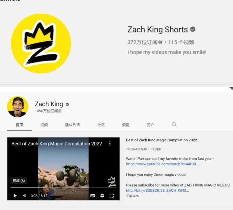 Zach King的YouTube频道和Shorts账号,图源:YouTube