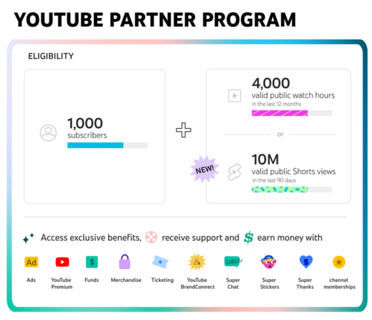 当下加入YPP的门槛是:在过去12个月内拥有1000个订阅粉丝、累计4000小时视频观看总时长。随着短视频内容不断扩充,保留原有YPP加入标准的同时,针对专注于Shorts的创作者,YouTube推出另一种YPP加入标准:在过去90天内获得1000个订阅粉丝、累计1000万次Shorts视频观看次数。