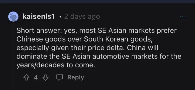 在Reddit论坛上,关于“中国汽车厂商是否正在拿下东南亚市场”的讨论中,一位用户的回复得到了最多的赞同票。“大多数东南亚市场更喜欢中国商品而不是韩国商品,尤其是考虑到它们的价格差异。未来几年,或者几十年,中国将主导东南亚汽车市场,并且有望通过电动汽车主导全球汽车行业,欧洲和东南亚将是第一战场。”他说道。