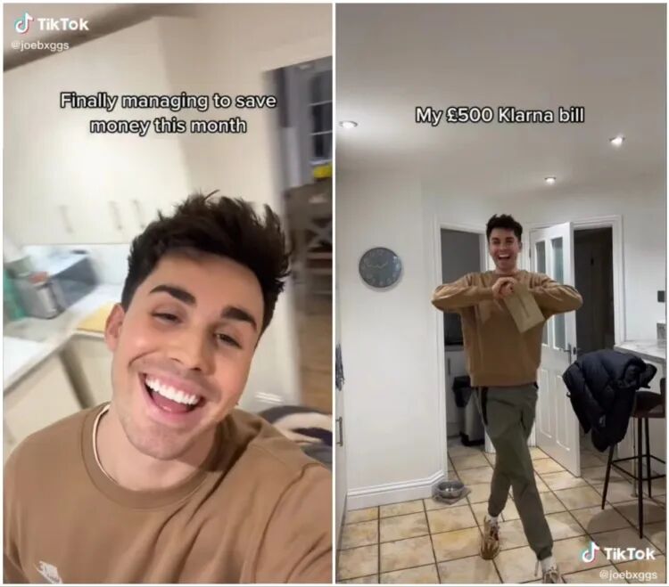 在TikTok上,年轻人们显然察觉到了先买后付带来的麻烦,但他们普遍对还款陷阱抱以调侃态度。配上“Anyone else relate?”(还有谁和我同感吗?)和哭脸emoji的文案,以及“这个月终于省下钱”的字幕,博主@joebxggs在一则短视频中满脸笑容。视频后半段,500英镑Klarna账单以更灿烂的笑容走向他,毫无疑问,攒钱计划又泡汤了。这则视频引发了广泛共鸣,获得近13万点赞。