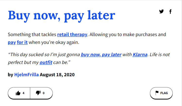 俚语词典Urban Dictionay网站的BNPL词条下有这样一条例句:“今天糟透了,我现在只想用Klarna的先买后付买点什么。生活并不完美,但我的外套可以是完美的。”