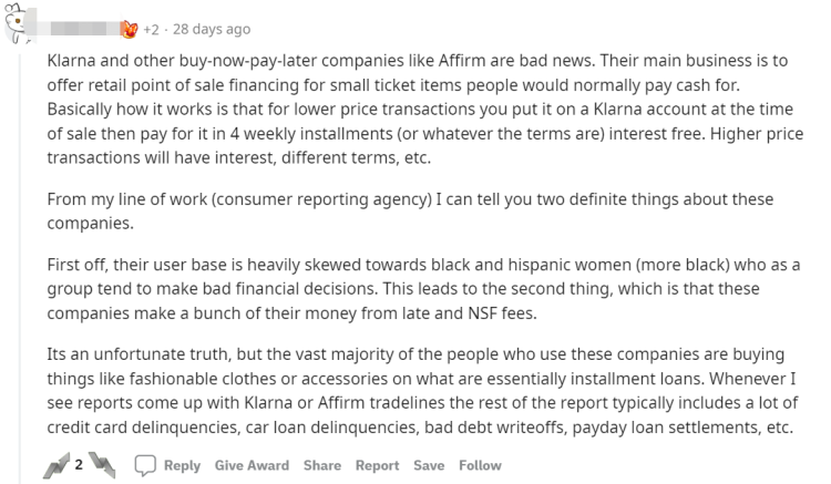 在reddit,一位就职于消费者报告机构的用户指出,Klarna、Affirm等公司的用户分布并不平均,大幅偏向于容易做出糟糕财务决策的群体。这使得他们更容易还不上款,陷入恶性循环,让先买后付公司从滞纳金和管理费用中赚到一大笔钱。