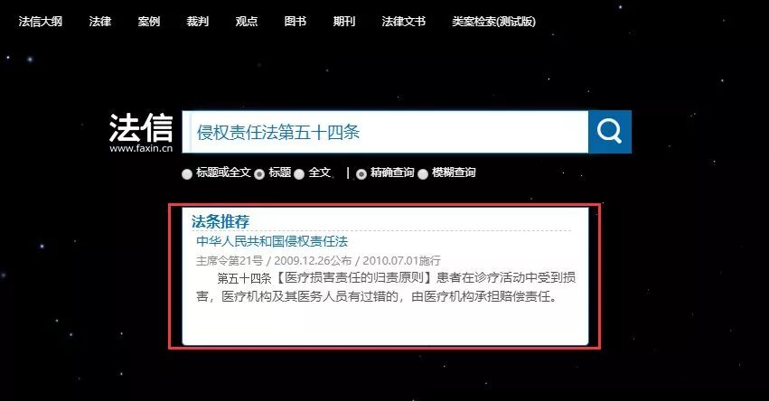 “法信”首页检索框中,直接输入 “侵权责任法第五十四条”,即可查看该法条具体内容,而不用跳转打开法律正文后再查法条。