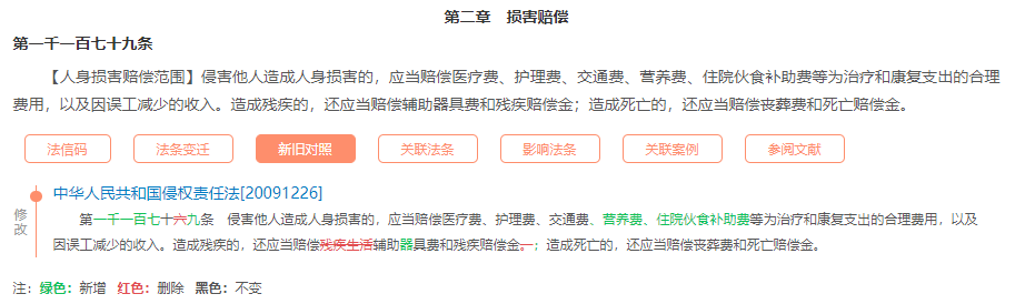 《民法典》第1179条来自于《侵权责任法》第16条,主要内容没有变动,只是做了两处修改完善:一是在列举为治疗和康复支出的合理费用中增加了“营养费”、“住院伙食补助费”,二是将“残疾生活辅助具费”修改为“辅助器具费”。