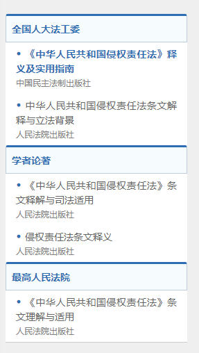 首先推送了原全国人民代表大会常务委员会法制工作委员会副主任王胜明编写的《中华人民共和国侵权责任法条文解释与立法背景》、全国人大常委会法制工作委员会编写的《中华人民共和国侵权责任法释义及实用指南》,两本书中对这一条从立法原意方面的解释——