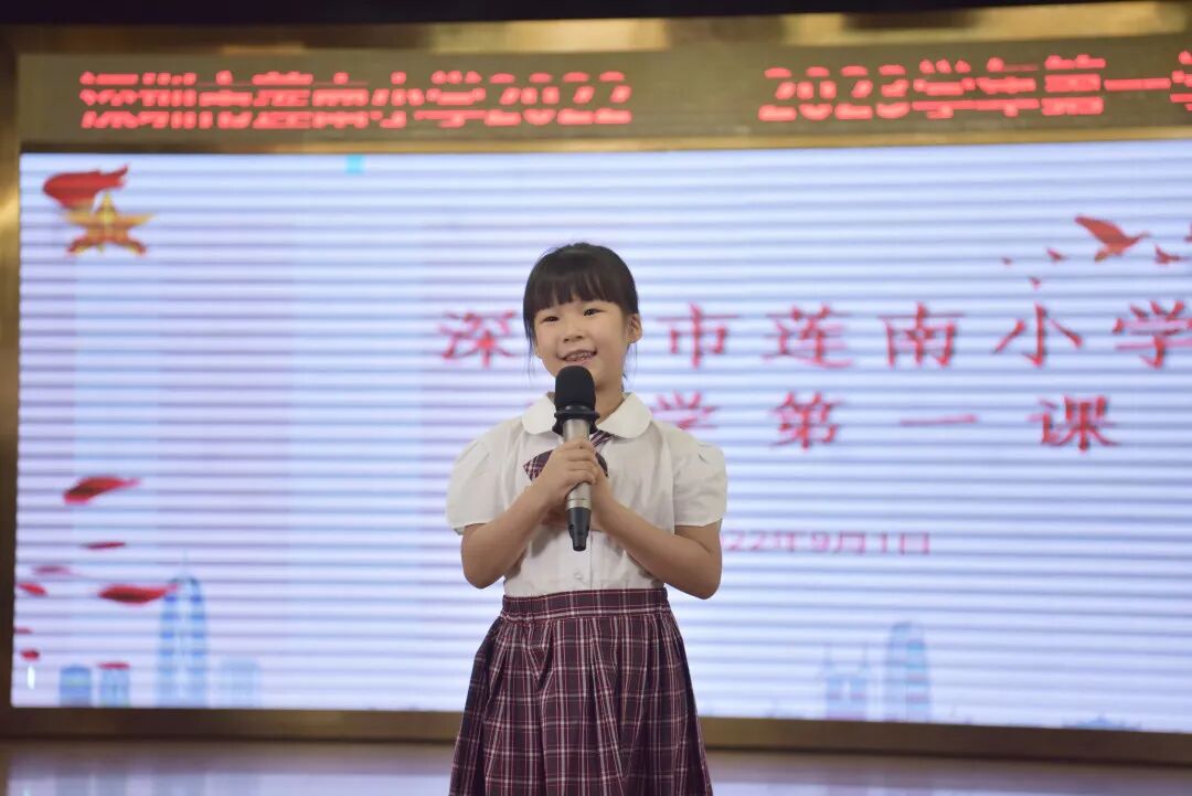 莲南小学一年级新生代表洪语萱同学发言,她用稚嫩的声音,许下了新学期好好学习、争做一名新时代阳光好少年的庄重承诺。
