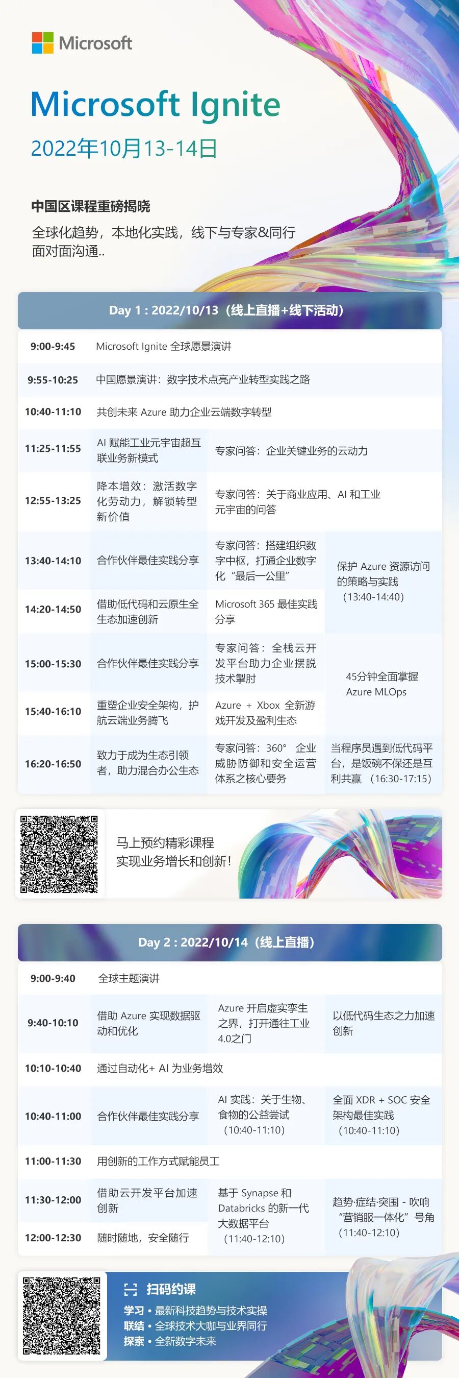 10 月 13 日-14 日,年度技术趋势与行业应用风向标 Microsoft Ignite 来袭,大会以“用微软云,尽享事半功倍”为主题,由微软 CEO 萨提亚·纳德拉带队,微软全球执行副总裁、微软云及人工智能事业部 Scott Guthrie、微软 Azure CTO Mark Russinovich等微软高管专家天团齐聚,分享 AI、混合云、元宇宙、低代码、数据智能、安全等前沿话题,交流最新行业实践及解决方案。