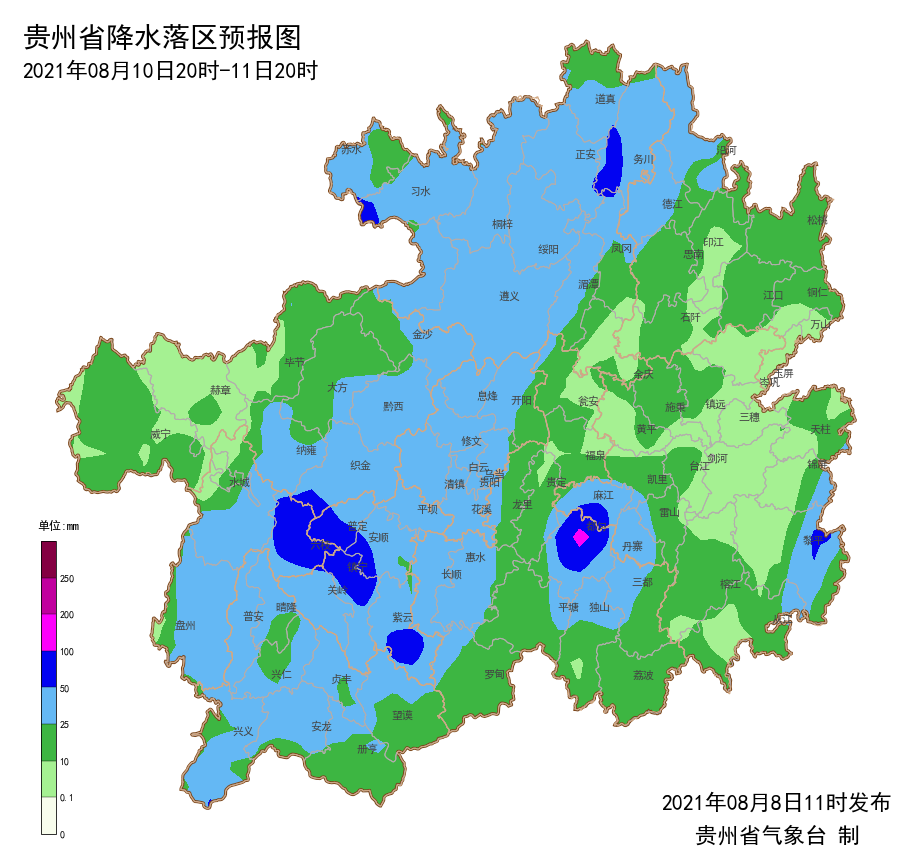8月8日20时-8月9日20时:省的中北部地区有一定的地质灾害气象风险,其中,遵义市中北部、毕节市北部地区地质灾害风险较高,其余地区的地质灾害气象风险低,请注意防范。