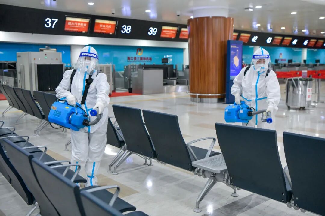 7日,海口美兰国际机场的工作人员进行消杀作业。