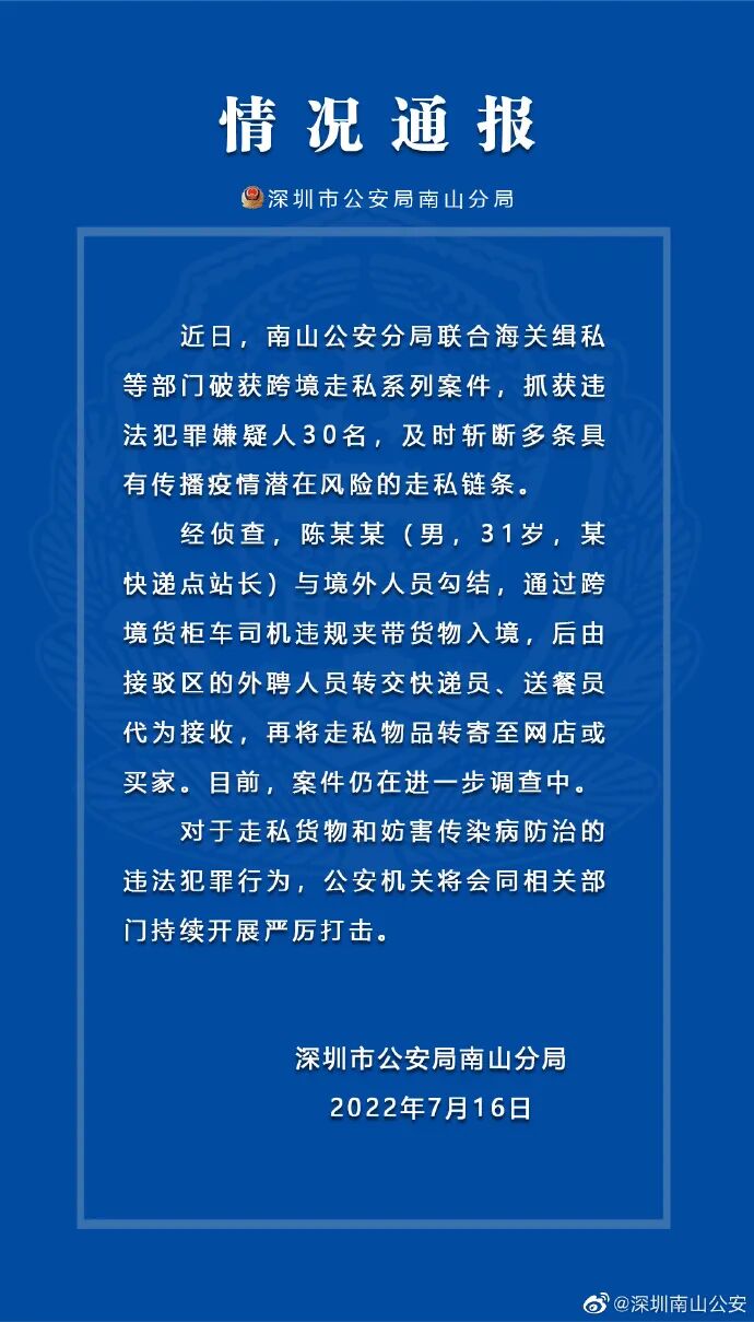 近日,南山公安分局联合海关缉私等部门破获跨境走私系列案件,抓获违法犯罪嫌疑人30名,及时斩断多条具有传播疫情潜在风险的走私链条。