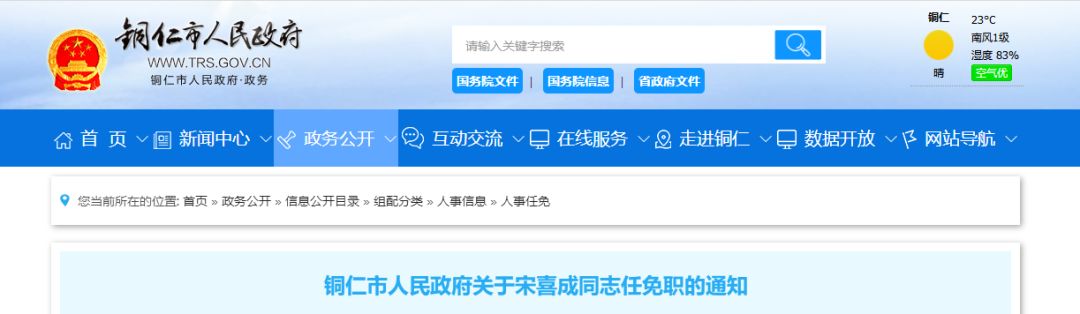 宋喜成任铜仁市人民政府副秘书长(保留正县长级),免去其铜仁市投资促进局副局长职务。