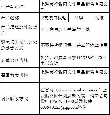 上海英雄集团文化用品销售有限公司将召回2019年11月1日生产,规格/型号为893-2的2支装白板笔(生产批号/批次:2019-11-1),涉及1000套。