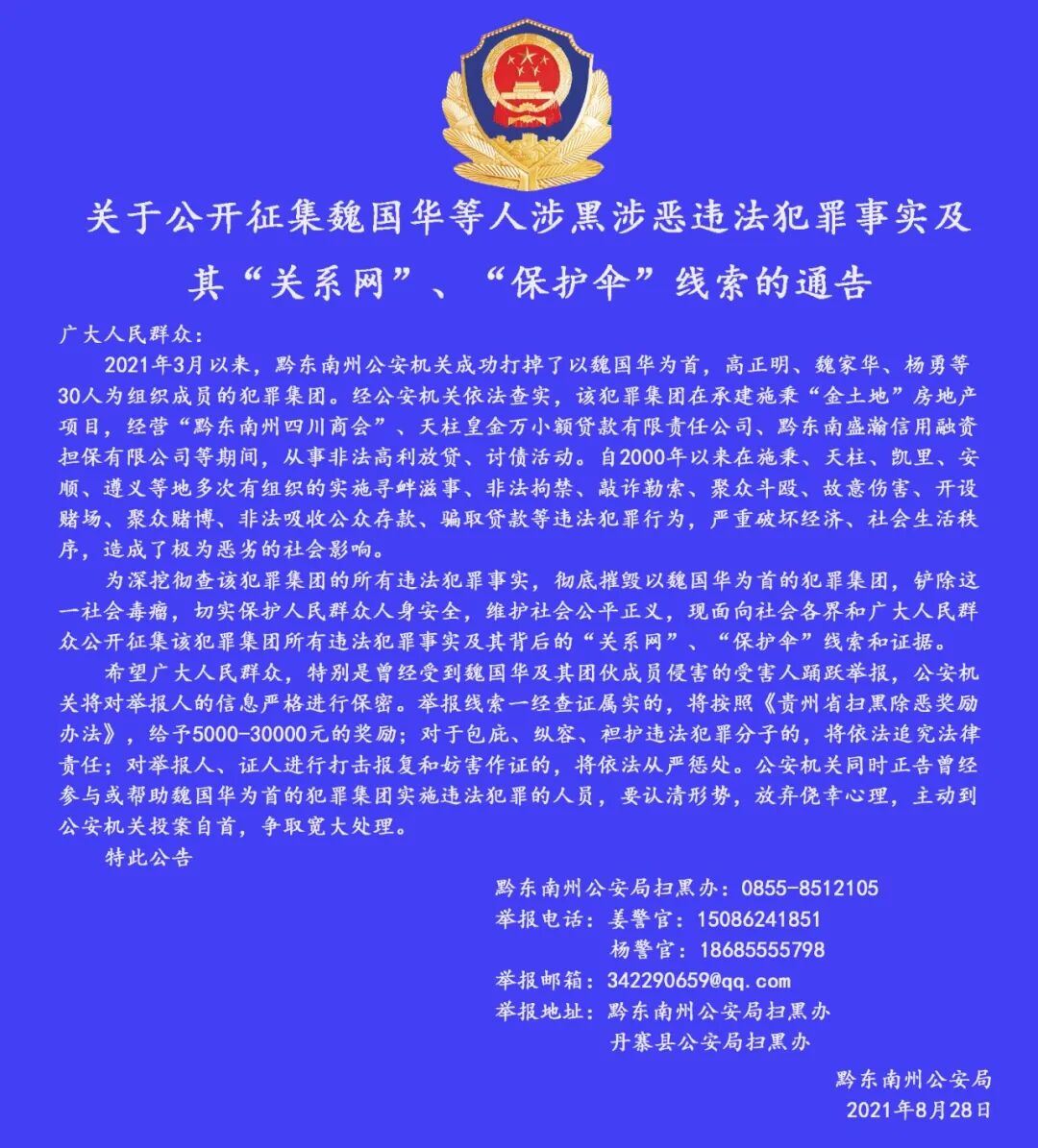 希望广大人民群众,特别是曾经受到魏国华及其团伙成员侵害的受害人踊跃举报,公安机关将对举报人的信息严格进行保密。举报线索一经查证属实的,将按照《贵州省扫黑除恶奖励办法》,给予5000-30000元的奖励;对于包庇、纵容、袒护违法犯罪分子的,将依法追究法律责任;对举报人、证人进行打击报复和妨害作证的,将依法从严惩处。