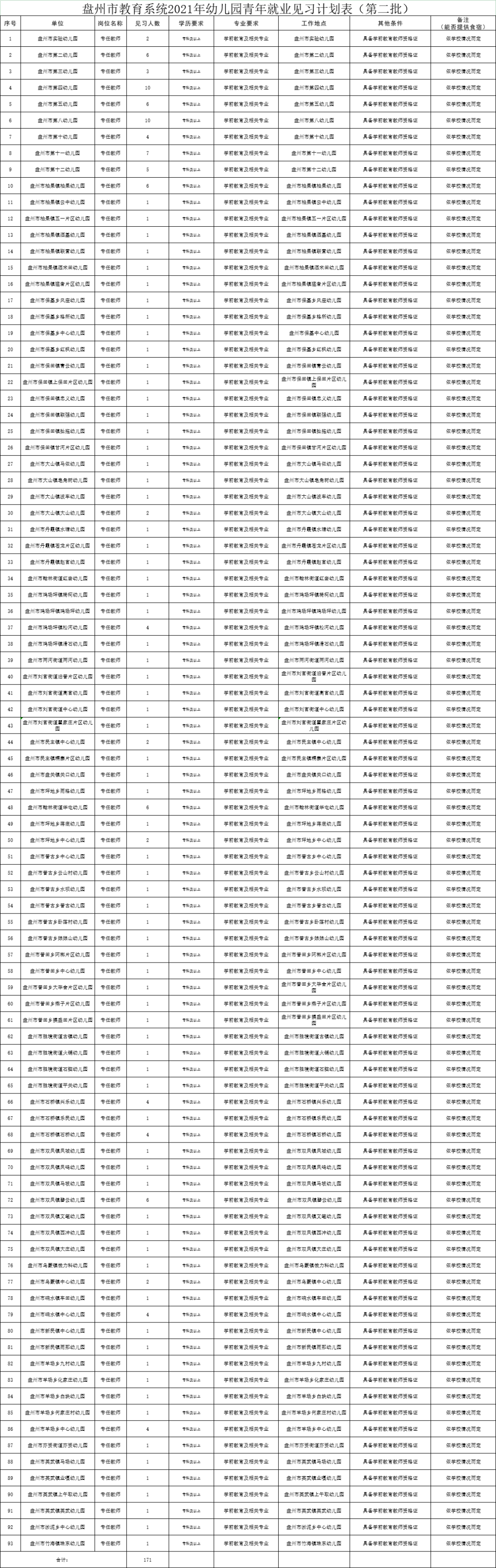 盘州市教育系统学前教育阶段93所幼儿园提供见习岗位171个,专业为学前教育及相关专业,具备教师资格证。