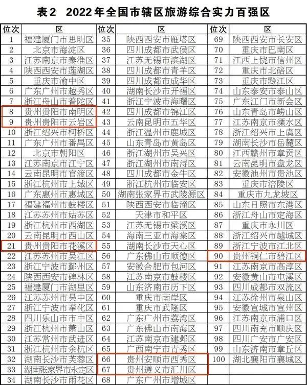 贵州省贵阳市南明区、云岩区、花溪区,安顺市西秀区,遵义市汇川区,铜仁市碧江区上榜“2022年全国市辖区旅游综合实力百强区”,分别位列第8位、第9位、第21位、第66位、第67位、第90位。