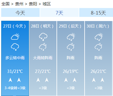 今天午后到明天白天,全省大部多云转阴天有阵雨或雷雨,其中遵义市东部和南部、铜仁市大部、贵阳市、毕节市大部、六盘水市、安顺市北部、黔南州北部、黔东南州西北部及黔西南州北部局地有大雨或暴雨,雷雨中局地有8级以上大风、短时强降水及小冰雹等强对流天气;