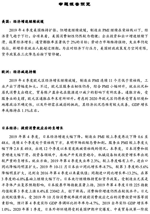 美国经济增速继续放缓。2019年4季度,制造业PMI继续在荣枯线以下,自2019年8月以来,美国制造业PMI一直位于荣枯线下方,12月PMI仅有47.2,创下2009年6月以来最低值。具体来看,美国消费韧性仍然较为高,自2018年3季度以来,美国个人消费支出同比增速已连续4个季度稳定在2.6%左右,消费仍是支撑美国经济增长的稳健动力。劳动力市场维持强劲,失业率较3季度进一步下降,新增非农就业人数超过预期。但企业投资和出口增速继续下滑,拖累经济增长;通货膨胀率进一步下降,核心PCE依然低于2%的货币政策目标。美联储在三次降息后按下暂停键。2019年美联储共降息三次,在12月联邦公开市场委员会(FOMC)会议决议中,决定维持联邦基金利率目标区间在1.50%-1.75%不变,该决议获得委员会全体成员的一致同意。这主要是因为美联储认为核心考量指标“通胀率”仍保持低迷,但当前的货币政策立场对于支持经济的持续扩张、就业和通胀目标是合适的,美联储将会继续监控经济前景的变化情况。点阵图显示,大多数官员认为明年美联储货币政策很可能会保持不变,但随着时间推移,部分委员认为利率应重回上升轨道。鲍威尔称,加息需要看到持续的、显著的通胀提升。欧元区经济继续下行。欧元区19国综合采购经理人指数(PMI)4季度均值为50.7,较上季度的均值51.2下滑0.5。不过,12月综合PMI小幅回升至50.9,高于市场预期的50.7,显示出企稳迹象。制造业PMI表现依旧低迷,4季度欧元区制造业PMI均值为46.4,与上个季度持平。12月制造业PMI为46.3,低于预期的47.3和前值46.9,连续第11个月低于荣枯线。欧元区制造业产能利用率继续下滑,德国12月制造业继续表现疲弱,12月制造业PMI下滑至43.7。2019年3季度产能利用率为82.2%,较上季度的82.7%再下跌了0.5个百分点。德国制造业恶化程度最突出。2019年4季度,欧元区制造业产能利用率为81.3%,较上季度下跌了0.9个百分点。11月欧元区商业信心指数为99.5,是2013年7月以来的最低水平,显示企业对未来商业状况依旧悲观。欧央行维持三大关键利率不变。12月12日,欧央行议息会议决定继续维持欧元区三大关键利率不变,符合市场预期;重申维持11月开始的每月200亿欧元的资产购买计划规模(QE)不变,直至下次加息前,并预计该计划将在一段必要的时间内持续,以增强宽松效果。这次会议是欧央行首位女行长、国际货币基金组织(IMF)原总裁拉加德11月上任以来首次主持的欧央行议息会议,因此备受市场瞩目。有外界分析认为,拉加德可能会提供政策重新评估和丰富政策工具箱等线索,但此次会议并未提及。拉加德在发布会上表示,在欧元区通胀预期朝着接近但低于2%的水平出现强劲增长势头前,预计欧元区基准利率将维持在当前水平或更低水平。日本经济增速大幅下降。2019年第4季度,日本制造业PMI较上季度再次下降0.6至48.6,连续4个季度处于荣枯线下方,表明市场收缩态势加剧;服务业PMI较上季度大幅下降2.8至49.8,出现12个季度以来首度跌破荣枯线的情况。日本消费和投资增速大幅下滑。投资各领域中,房地产开发投资趋冷,机械设备相关投资增长率出现较严重的负增长。消费方面,从商业销售额看,第4季度10月和11月合计一般商品零售额同比增长率由3季度的2.3%下滑至-8.7%,汽车零售额同比增长率由第3季度的7.5%转为-11.2%。进出口同比降幅均明显扩大。出口方面,2019年10-11月日本出口同比增长率-8.7%,较第3季度的-5.6%降幅明显扩大,达到自2016年第4季度以来最低值;同期进口同比增长率-13.2%,在第3季度的-6.0%基础上继续大幅下行。受2019年10月份消费税率提升提前消费效应之后的消费投资回落等因素影响,预计第4季度实际GDP季调环比折年率为-4.7%,2019全年实际GDP增长率1.0%。日本银行继续维持宽松货币政策。2019年12月19日,日本银行发布的货币政策会议信息宣布维持现行超宽松货币政策不变。短期利率方面,日本央行政策存款利率维持在-0.1%水平。长期利率方面,为了将10年期国债利率控制在0%,日本央行将继续计划每年购买80万亿日元的长期国债。在长期国债之外的资产购入方面,日本央行将会继续每年增加保有价值6万亿日元的交易型开放指数基金(ETF)和价值900亿日元的不动产投资信托(J-REIT)。此外,还继续将所保有的融资债券(CP)和公司债券余额维持在2.2万亿日元和3.2万亿日元。尽管长期执行宽松货币政策,但日本大量流动性以超额存款准备金形式沉淀在银行为代表的金融机构。日本银行数据显示,2019年10月日本各金融机构存放在日本银行的超额准备金为344.3万亿日元。这让货币政策效果大打折扣。金砖国家维持缓慢增长。2019年金砖国家经济增速有所放缓,其中增速最快的印度经济下滑尤其明显,显示出金砖国家面临较大的经济增长压力。从制造业PMI来看,俄罗斯和南非均位于荣枯线下方,并有继续下滑的趋势。印度和巴西位于荣枯线上方,印度景气呈回升态势,但巴西有回落迹象。2020年金砖国家经济预计仍维持缓慢增长态势。货币政策成为刺激经济的主要发力工具,但部分国家政策利率已达到历史低位。对印度而言,通货膨胀上升也限制了货币政策进一步宽松的空间。东盟韩国现复苏曙光。2019年第4季度,东盟经济总体在底部企稳,韩国经济出现景气回升。东盟第4季度制造业PMI均值为49.2,与上季度持平。除了马来西亚和新加坡之外,其他东盟四国的PMI较上季度均下滑,其中印度尼西亚、