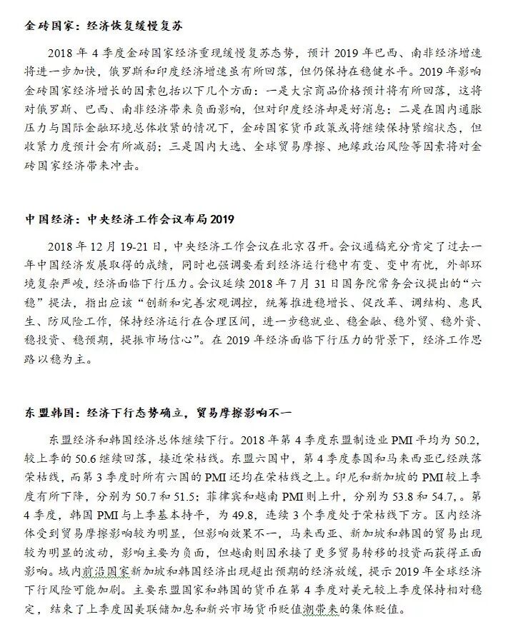 金砖国家经济有亮点。全球经济放缓背景下,俄罗斯、印度、巴西、南非四个经济体4季度的制造业PMI均较上个季度明显回升。2018年9月,南非政府公布了一系列经济刺激政策,成为提振南非经济的重要因素。2019年1月1日,雅伊尔·博尔索纳罗宣誓就任巴西总统,尽管其经济政策细节并不明朗,但其提出的一系列改革被认为是“市场友好型”的,受到了市场的欢迎。
