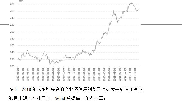 还可以看到,利息支出增速上升主要是对民营企业造成了冲击。2017年全年,民营企业产业债和央企产业债两者的利差,一直在110到150个基点之间波动。2018年年初开始一路攀升,在11月甚至一度突破280个基点(图3)。这种利差结构,不仅仅反映了债券市场上民企和央企之间融资成本的相对变化,而且和商业银行贷款等其他融资渠道的融资成本相对变化也是一致的。