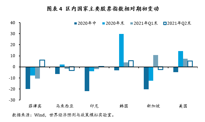 2021年第2季度,股票市场继续呈现涨跌不一的态势。和上季度较为类似,五个区域代表性股指在2021年第1季度涨跌不一。马来西亚吉隆坡指数和新加坡海峡指数季末较季初出现下降,变动幅度分别为-3.3%和-2.5%,印尼雅加达综合指数基本与上季度持平,变动幅度为0.25%。韩国综合指数上涨5.6%,高于美国标普500指数本季度涨幅。菲律宾马尼拉综合指数虽然上涨最多,为6.3%,但是由于其上季度的跌幅为-10.5%,2021年上半年总体仍呈现下跌态势。