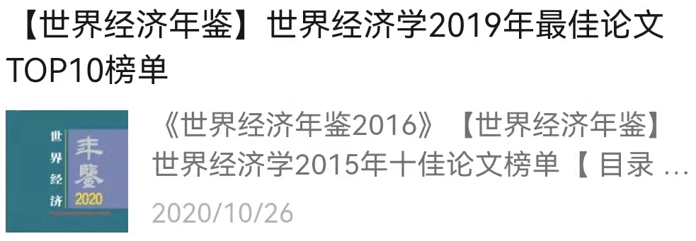 该榜单自2015年开始研制和发布,旨在把世界经济学的优秀论文评选出来并推广开来,以更好地促进世界经济学科的发展。其历年内容可在《世界经济年鉴》官方网页、微信公号“世界经济学文献”获得,并在《世界经济年鉴》相应各卷中正式出版(含每篇入选论文的内容概览)。