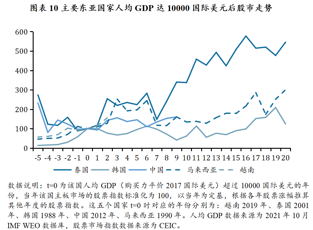 和区域内相似经济体的历史情况做一类比,越南股市的未来潜力和挑战并存。以人均GDP的情况来看,越南是在2019年突破了10000国际美元(IMF口径,2017年定基),下图考察了泰国、马来西亚、韩国和中国历史上突破10000国际美元时前五年和后二十年(取决于数据的可得性)股票市场的走势,为越南股市后期走势提供参考。由于该图为定基指数,因而比较的是各国股票市场的涨幅。各国人均GDP超过10000不变价国际美元的时间分别为:泰国2001年、韩国1988年、中国2012年、马来西亚1990年,大体上可以认为,人均GDP超过10000不变价国际美元的时间点是这些经济体制造业向服务业转移的时间点,在这个过程中,金融市场的深度提升,国内投资者对于股票市场的参与意愿提高。从东南亚地区发展模式相仿的泰国和马来西亚的情况来看,其股票市场在人均GDP突破10000时均呈现出急涨2-3年随后高位盘整的情况,在5年之后会有一轮下挫,随后再度上升和调整。以越南的情况进行类比,当下越南的股票市场走势与马来西亚的走势在前期较为吻合,这意味着,参考马来西亚的情况,越南股市仍有与当前规模相近的一波涨幅将在未来1-2年发生。如果比照中国的情况,越南目前的股市已经达到了中国经济在2012年转型后的涨幅高点,即将进入盘整期,考虑到中国股市的盘整出现在2015年,联储加息预期的因素和当前较为类似,越南出现类似于中国那样的调整也是可能的。越南的情况和韩国并不太一样,韩国股市在人均GDP超过10000不变价国际美元就开始下行,10年之内并未回到期初点位。从一个更长周期的情况来看,以韩国、泰国和马来西亚的情况来看,10年之后的股票市场还有一个较大程度的趋势性上涨。当然,上述特征的共性部分可作为预判越南股市中长期走势的一个参考,各国因面临的外部环境和自身发展情况的差异,在实际股票走势方面仍有巨大差异。