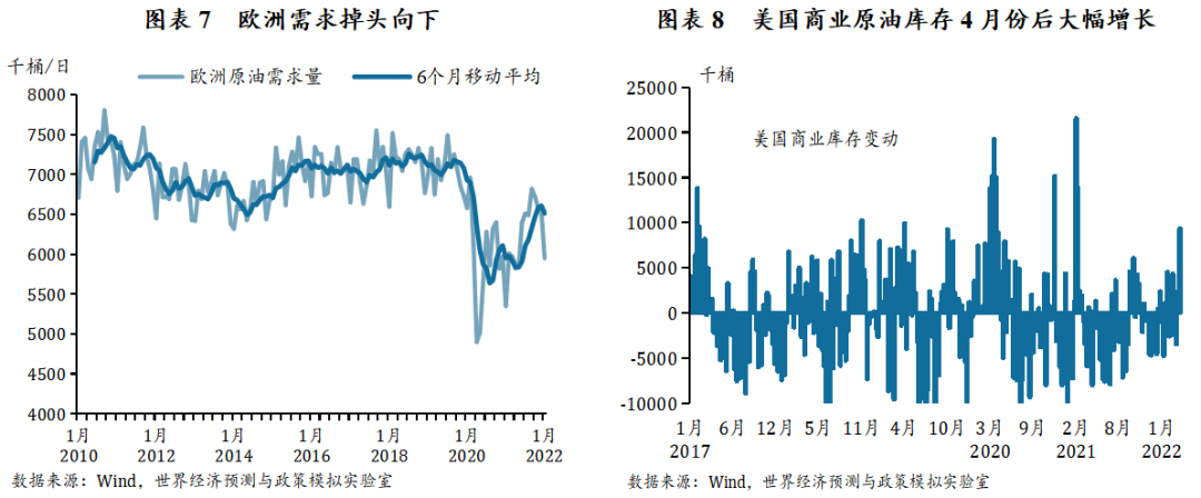 在供给端,俄乌战争对市场造成了极大扰动,包括主动和被动影响:一方面俄罗斯产能受战争动员和港口运输影响,出口量下降,另一方面,欧洲多个国家参与制裁,主动降低从俄罗斯进口规模,并希望逐步摆脱对俄罗斯能源供应的长期依赖。具体来看,在战前俄罗斯占全球产油量约10%比重。4月份俄罗斯原油日产量约1000万桶,相较于3月下降了4.5%,对应50万桶/日。该规模接近于2月份OPEC的单月增产规模。除了产量下降以外,俄罗斯实际出口规模因受到多国制裁,下降更为明显。作为全球第三大原油出口国家,俄罗斯日出口规模约500万桶,开战以来日出口量下降至400万桶以下。受此影响,市场一度陷入恐慌情绪,推升油价。