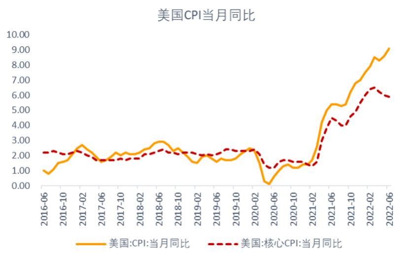 美国通胀再创新高,美联储加快紧缩进程。2022年6月美国CPI同比增速达到9.1%,超市场预期,为1981年以来的最大同比涨幅。美国就业市场势头依然强劲,美国2季度平均新增非农就业人数39.7万,失业率维持在3.6%,劳动参与率环比微降0.1个百分点至62.2%。