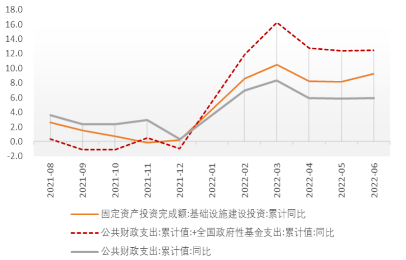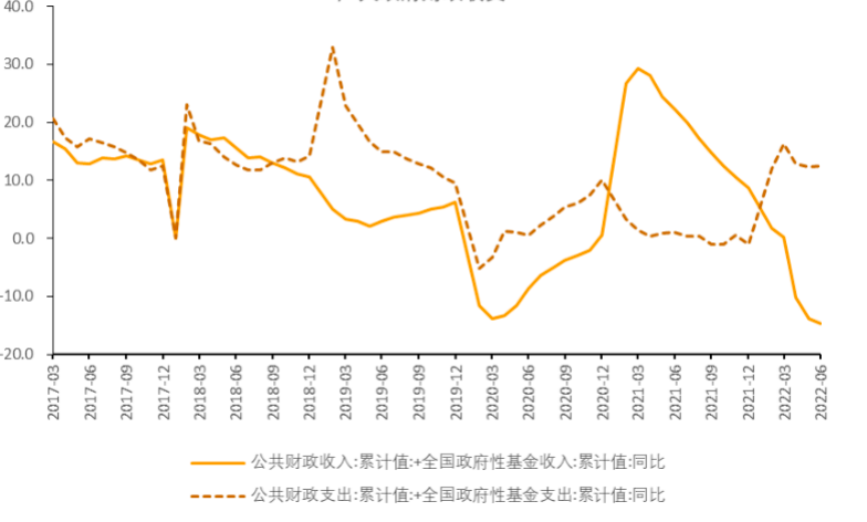 财政收支面临缺口,专项债发行进度快于往年。2022年1-6月,政府公共财政支出同比增速5.9%,政府基金性支出同比增速31.5%,广义财政支出同比增速12.4%,较1季度末的累计同比增速16.2%略有下降。1-6月,政府公共财政收入同比增速-10.2%,政府基金性收入同比增速-28.4%,广义财政收入同比增速-14.7%,较大幅度落入负增长区间。2022年专项债发行使用工作进度明显快于往年。截至6月末,国债、地方一般债和专项债累计发行4.65万亿元,其中专项债已经累计发行3.4万亿元,基本完成了全年的发行计划。