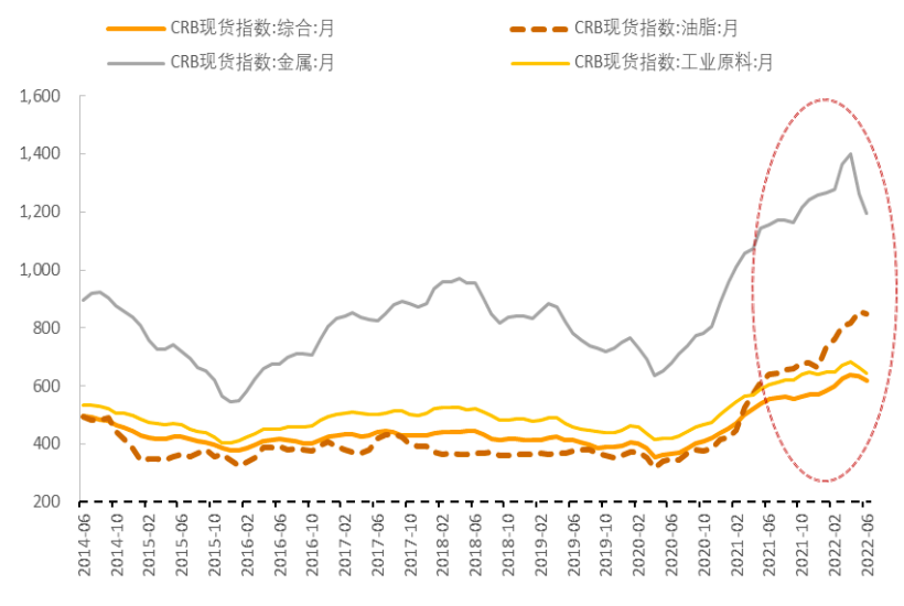 大宗商品价格高位回调。在全球金融条件收紧和经济下行预期影响下,2022年2季度CRB大宗商品价格综合指数618.5,较1季度末回落1.4%。其中油脂分项增长5.6%,金属分项回落12.3%,工业原料分项回落4.3%。2季度,布伦特原油现货和期货价格最高涨至132.2美元/桶和123.6美元/桶,分别较1季度末上涨19.8%和14.5%,季末震荡调整,分别回落至120.5美元/桶和114.8美元/桶。欧佩克与非欧佩克产油国(OPEC+)第30次部长级会议重新确认产量调整计划和每月产量调整机制,并决定将今年8月的月度产量上调至64.8万桶/日。