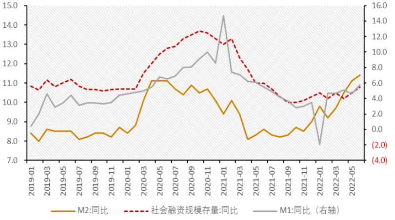社融存量增速回升,新增社融较去年同期增加。2022年6月,社会融资规模存量增速较1季度末回升0.3个百分点至10.8%,M1同比增速较1季度末回升1.1个百分点至5.8%,M2同比增速较1季度末回升1.7个百分点至11.4%。2季度新增社会融资规模8.9万亿,较去年同期上升1.4万亿。
