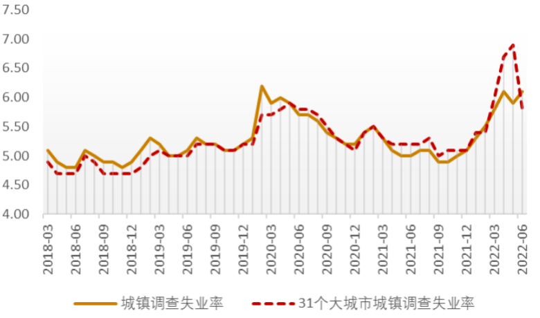 就业仍存在较大缺口,青年群体就业形势严峻。2022年2季度,31个大城市调查失业率从3月的6.0%攀升至4月的6.7%和5月6.9%,是该数据发布以来的最高点。进入6月后随着疫情防控压力下降,调查失业率回落至5.8%。青年群体就业形势严峻,16-24岁人口的调查失业率2022年2季度均值为18.6%,较1季度均值再上3.1个百分点,显著高于疫情前正常时期2018-2019年2季度均值10.3%,同样高于疫情后2020-2021年2季度均值14.5%。根据教育部统计,2022年中国高校毕业生人数破千万大关,随着高校毕业生进入劳动力市场,年轻群体就业压力更大。此外,25-59岁中年群体也承受着较大压力。在部分行业裁员,且劳动力市场供需之间存在摩擦的情况下,该群体通常难以迅速再就业。