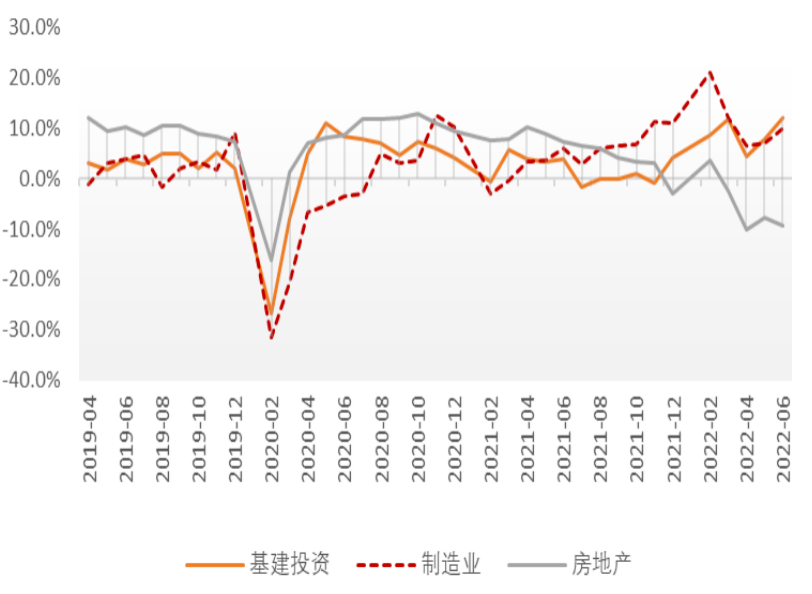 2022年二季度不变价GDP同比增长0.4%。4月的突发疫情同时给供给和需求造成了严重冲击。随后供给端开始改善,生产和物流都得到了迅速修复。相比之下,需求端的恢复整体偏慢。除了供需层面的差异,本轮宏观的差异性还体现在私人部门和政府部门层面。一方面,与私人部门相关的需求依然保持低迷。居民消费复苏明显比较缓慢;房地产行业仍在探底,从购地到投资、新开工,再到销售均未有实质性改善;在出口回落压力逐步加大的背景下,制造业投资也已经开始减速。另一方面,政府部门明显发力,部分对冲了经济下行压力,在稳增长、稳信用方面发挥了重要作用。