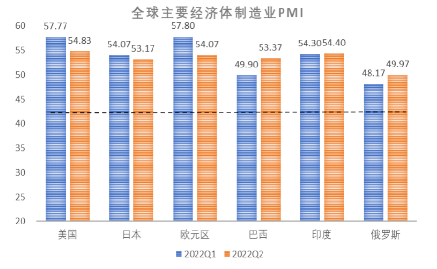 2022年2季度,摩根大通全球综合PMI和全球制造业PMI均值分别为52.0和52.3,分别较2022年1季度均值下降0.4和1.0个百分点。在全球金融条件紧缩、疫情反复和地缘政治冲突的多重因素影响下,全球制造业增速有所放缓。分国家来看,美国、欧元区和日本等发达经济体2季度制造业PMI均值均出现不同程度下降,巴西、印度和俄罗斯等新兴市场经济体2季度制造业PMI均值有所回升。