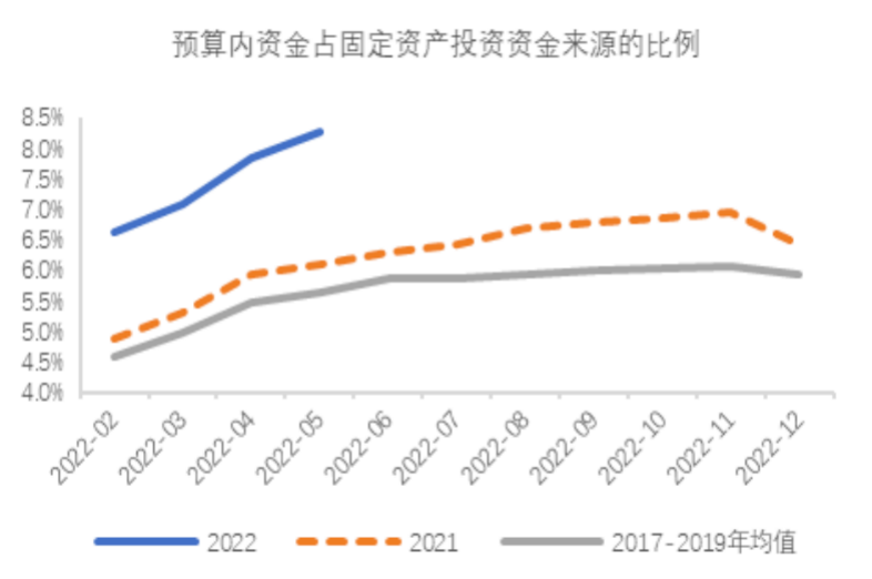 本轮政府部门发力的过程中,基建投资与广义财政支出的联动性明显增强。2013-2017年,基建投资年均增速为17.3%,而广义财政支出增速只有10%左右,且个别年份还不到基建投资增速的一半。2018-2020年,基建投资年均增速只有2.8%,广义财政支出年均增速则达到11.3%的水平。2021年以来,广义财政支出与基建投资的关联性开始增强。一个比较直接的证据是,预算内资金占固定资产投资资金来源的比例较过去5年有显著提高。年初至今,预算内资金占固定资产投资的比例系统性地提高了2.5个百分点。在所有投资中,基建相关的投资对应了更多的预算内资金。如果这些新增的预算内资金主要对应了基建投资,那么按照25%的占比来看,或许意味着预算内资金占基建投资的比重系统性地上升了10个百分点。