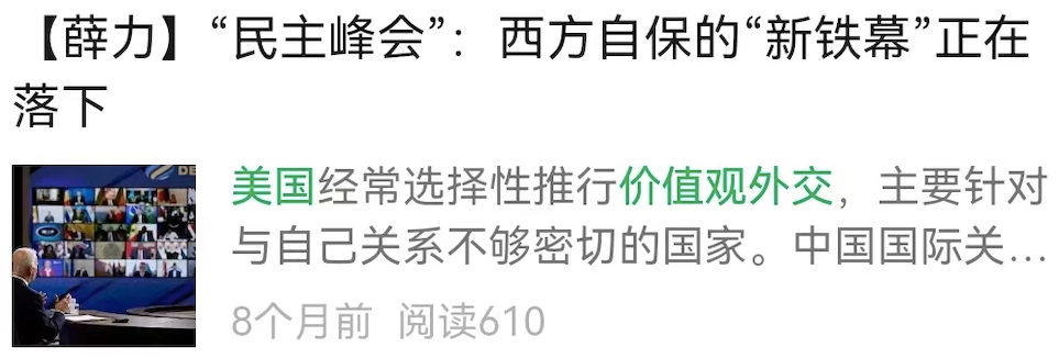 西方国家在干涉中国新疆、香港、台湾等内政问题上越来越激进,中西意识形态对抗大幅升级。美国在欧洲成功推动乌克兰危机,挑起了俄乌冲突,搭建起了冷战式的对抗格局。美国以所谓“民主对专制”的价值观外交,推高了大国对抗,有使世界重新滑入冷战的危险。