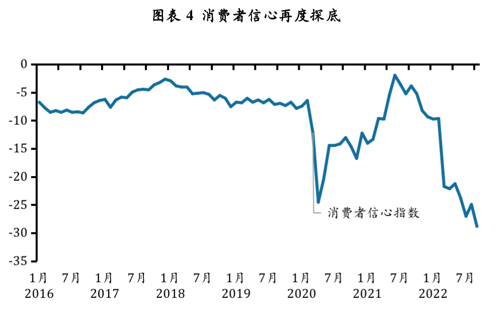 消费者信心再度探底。2022年9月欧元区消费者信心从8月的-24.9下跌至-28.8,再创历史新低,不及预期的-25.5,同时也远低于其长期平均水平-11,和2020年春季新冠疫情爆发初期的低点。这表明在能源危机面前,人民担心生活成本上升和经济增长放缓,消费者情绪持续遭受重创。