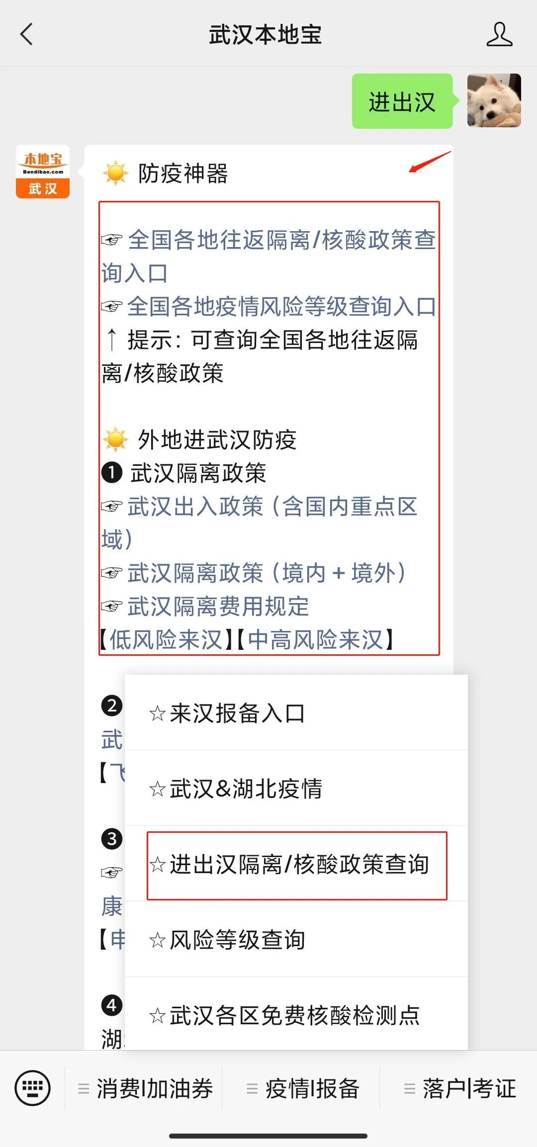 ②在菜单栏找到【进出汉隔离/核酸政策查询】直接回复【进出汉】即可获取进出汉最新防疫政策、外省来返健康申报入口等。