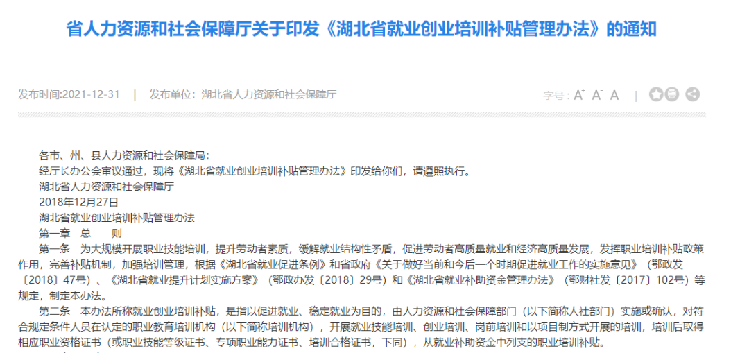 根据湖北省人力资源和社会保障厅印发的《湖北省就业创业培训补贴管理办法》:
