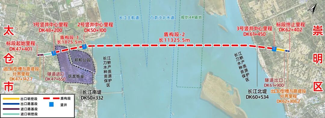 崇太长江隧道上距已建苏通长江大桥约31.7公里,下距已建上海长江隧桥约54.0公里,于江苏省太仓市七丫口附近下穿长江南支,隧道穿越位置江面宽度约10公里,最大覆土厚度约54.5米,穿越长江水域最大水深约29.5米。