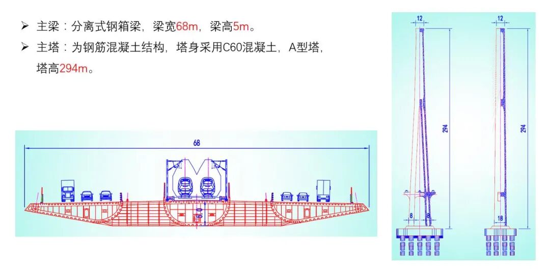 大桥在国内大跨度桥梁中首次采用斜拉悬索协作体系,有效提高了桥梁竖向、横向和扭转刚度。主梁采用抗风性能更优的三箱分离式钢箱梁结构,大桥的梁宽达68m,成为世界同类型中最宽的桥梁,将超过目前在建最宽的渝昆高铁宜宾临港长江公铁大桥(63.9m)。
