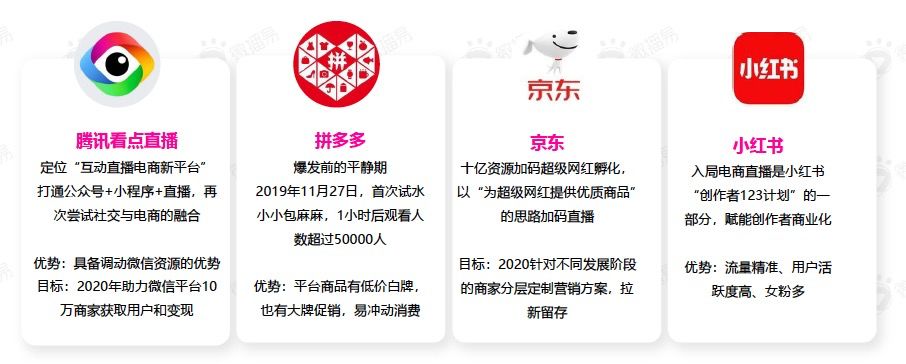 其他平台:腾讯看点、拼多多、京东、小红书为了进一步提升平台的商业能力,未来将在正在开放进一步的电商直播计划,未来商家的机会不可估量。